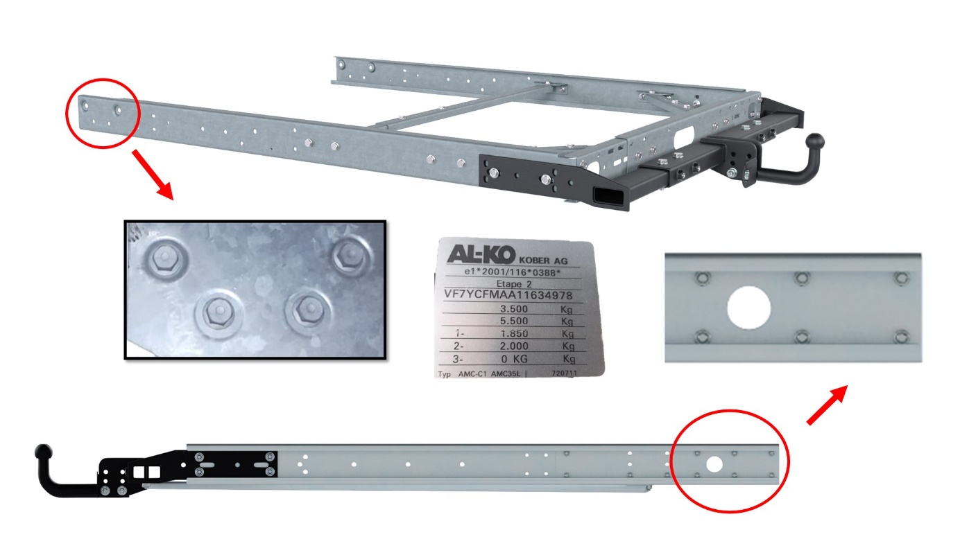 Le montage implique des platines et renforts boulonnés sur le châssis AL-KO ; dans certains cas des éléments soudés d’usine sont proposés par des équipementiers. L’alignement longitudinal et latéral est primordial : un montage mal aligné génère des efforts dynamiques supplémentaires et peut provoquer des fissures sur les points de fixation. Les fabricants spécialisés (comme Ximplio) proposent des kits spécifiques pour châssis AL-KO, avec homologations ou certificats de conformité selon modèle.