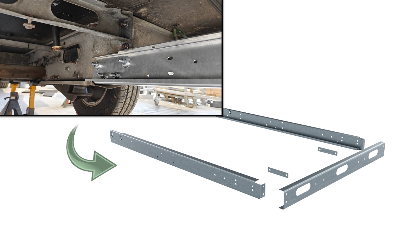 Une rallonge de châssis est un prolongement métallique fixé à l’extrémité arrière du châssis principal. Son but est de créer une plateforme structurelle capable de supporter des charges externes (porte-vélos / porte-moto, scooter, attelage).